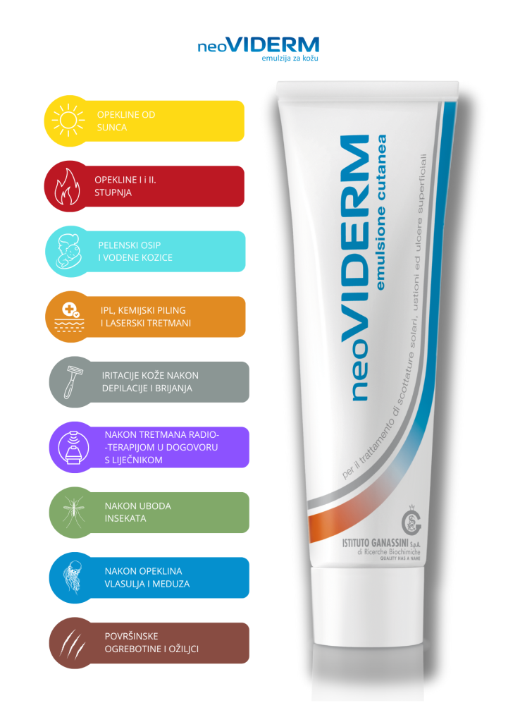 neoVIDERM je višenamjenska emulzija za cijelu obitelj koju bi svako kućanstvo trebalo imati u svojoj „kućnoj ljekarni“, jer ublažava opekotine od sunca, opekline 1. ili 2. stupnja, ogrebotine, ubode insekata, iritacije kože nakon depilacije, brijanja i drugih kozmetičkih tretmana… Sve te površinske ozljede – posjekotine, ranice, iritacije i opekline zahtijevaju trenutačnu njegu. Upravo njima brzo i efikasno pomaže neoVIDERM.