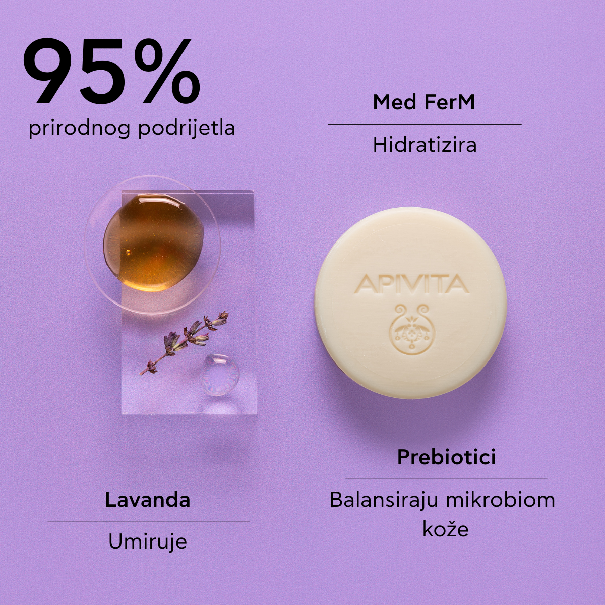 Dodatak prebiotika štiti i osnažuje kožu kako bi zaštitili njenu mikrobiotu. Ekstrakt cvijeta lavande daje koži osjećaj ugode i umirenja.
