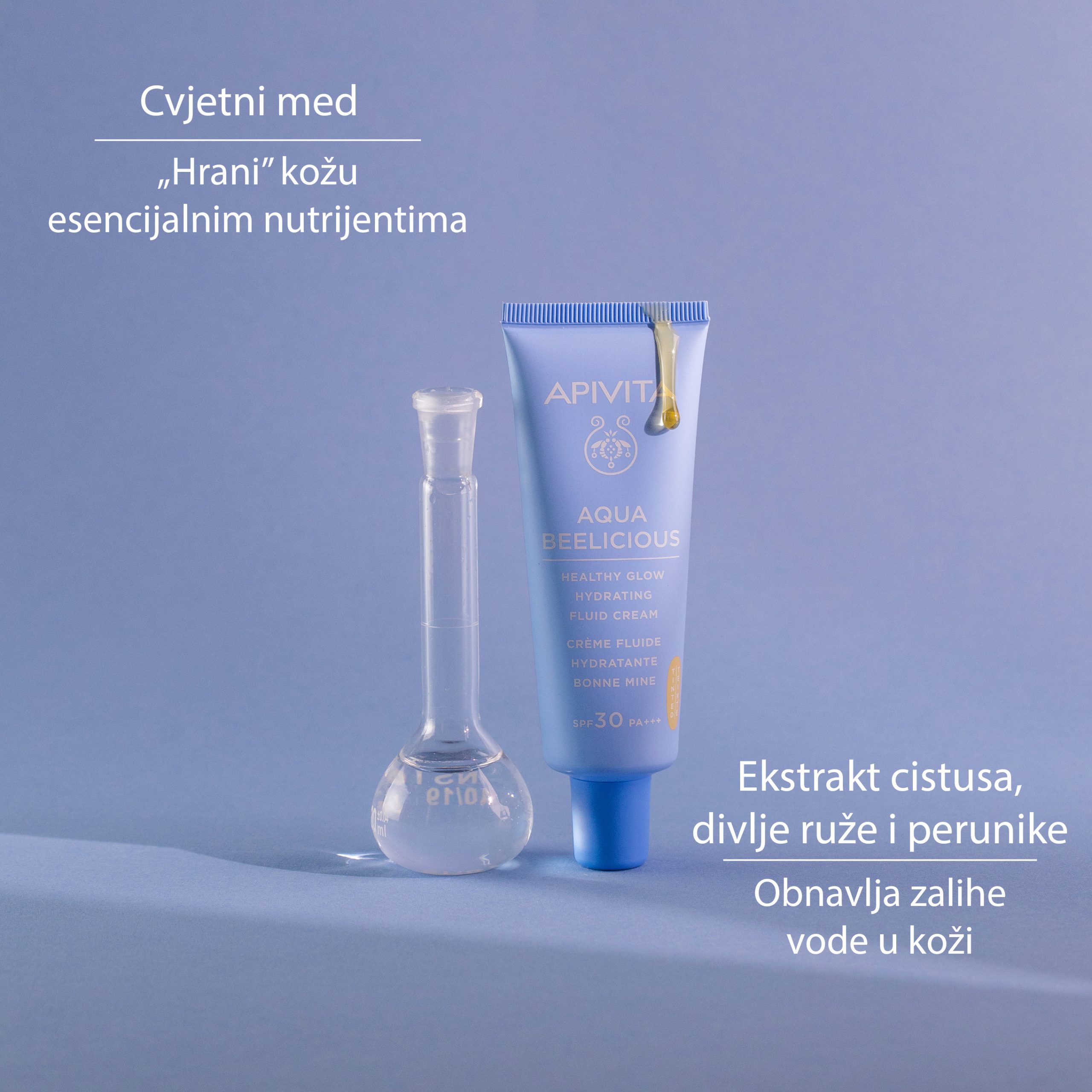 APIVITA AQUA BEELICIOUS all in one dnevna krema koja pruža hidrataciju, zaštitu od UVA/UVB/BLUE LIGHT zračenja uz SPF30 i ujednačavanje tena uz toniranu pokrivnost neutralne nijanse. Obnavlja hidrataciju kože uz osvježavajuću fuziju cvijeća (cistus, iris, divlja ruža) i ekstrakt meda.