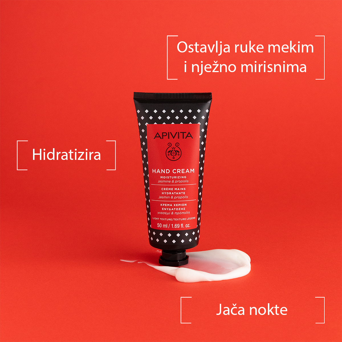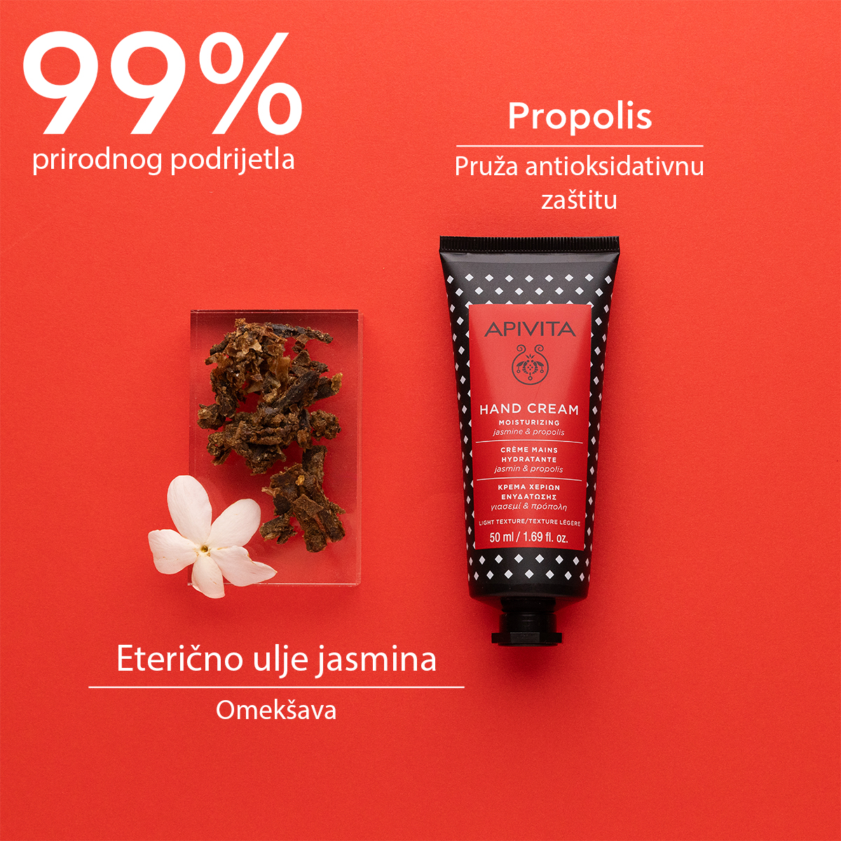 Hidratantna krema za ruke s jasminom i propolisom idealna je za dubinsku njegu ruku, a u sebi sadrži 99% sastojaka. Hidratantna krema održava prirodnu ravnotežu hidratacije ruka i noktiju, a kožu ostavlja mekom i podatnom s blagim mirisom jasmina.